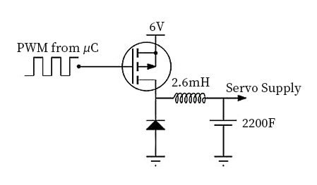 The proposed voltage profiling technique seeks to limit the supply voltage provided to the servo for a short period of time as the servo turns on. This is similar to traditional digital motor control techniques where some form of modulation allows proportional control over the motor. The implementation of the voltage profiling uses a P-Channel Metal-Oxide-Semiconductor Field-Effect Transistor (MOSFET) which is driven by a PWM output on the micro controller with a frequency of 200kHz. A LC (Inductor-Capacitor) first order Low Pass Filter (LPF) with a cut-off frequency of 66Hz is attached to the output of the MOSFET to filter the switching noise in order to provide the servo with a sufficiently stable DC voltage. As the voltage is controlled by the micro controller using PWM (a common technique for Digital to Analog Conversion), a wide variety of voltages can be produced to supply power to the servo.